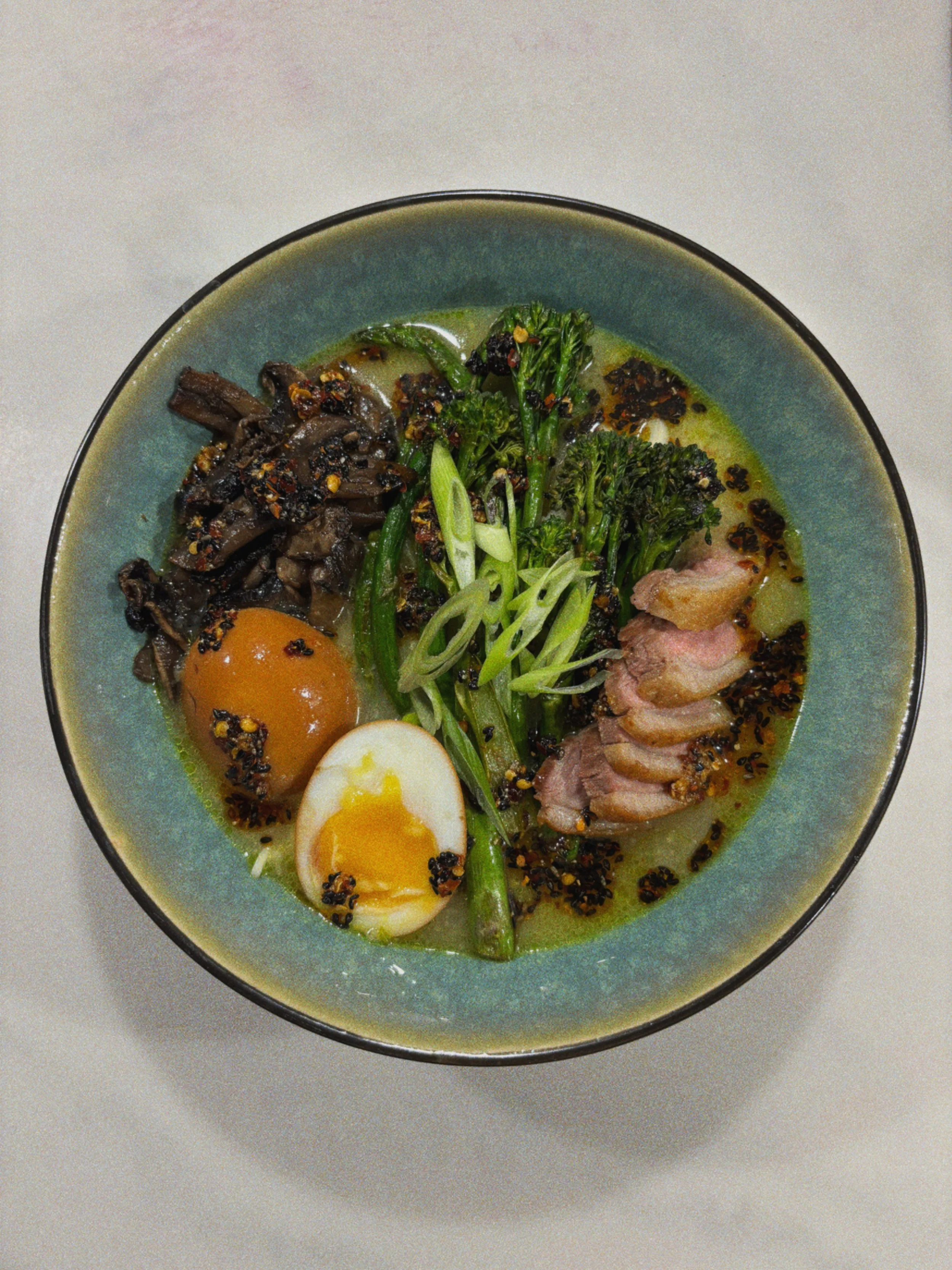 I always add my homemade chilli oil, maybe some extra sesame seeds or a pile of fresh greenery. With the duck leg ramen I crisped up the skin in the pan and chopped it up into a rough crumble - crunchy little pockets of richness. On another I fried sliced mushrooms in knob of miso and a splash of shoaxing wine as an extra topping.