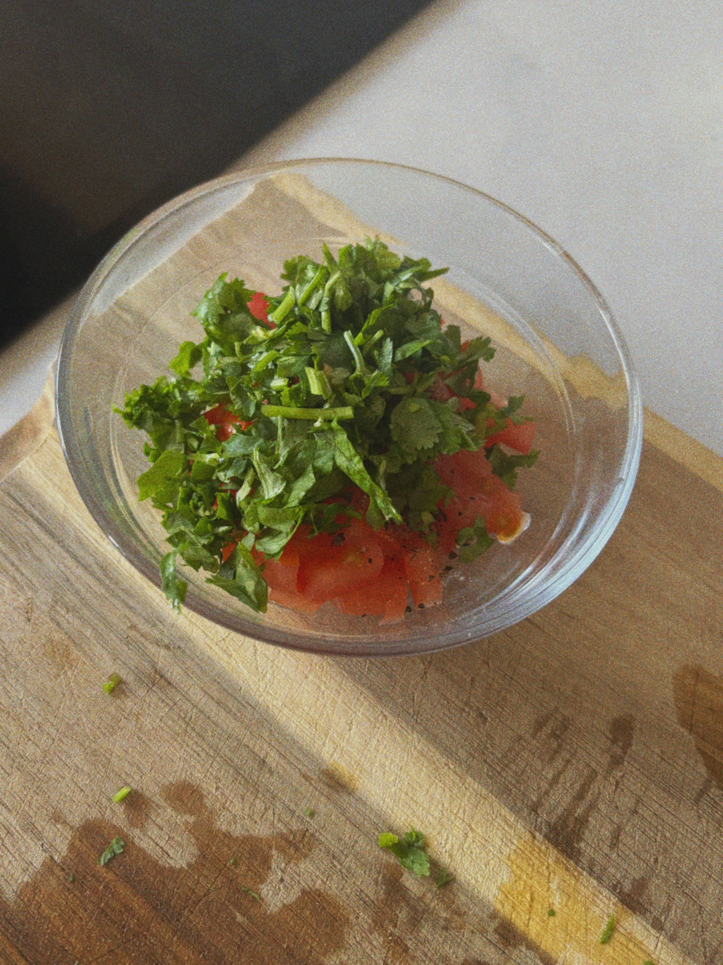 We’ve got our Salt, bacon, we’ve got our Fat, mayonnaise and buttery eggs, we’ve got our Heat, chipotle. Now we need acidity. This also goes for something fresh and vibrant. With the mexican vibes coming from the chipotle and tortilla, I thought about a pico de gallo. I had a salad tomato rolling around the veg drawer and the last of a bunch of coriander. No onion unfortunately, but, desperate times and all. So I got to chopping and seasoned with salt and pepper.