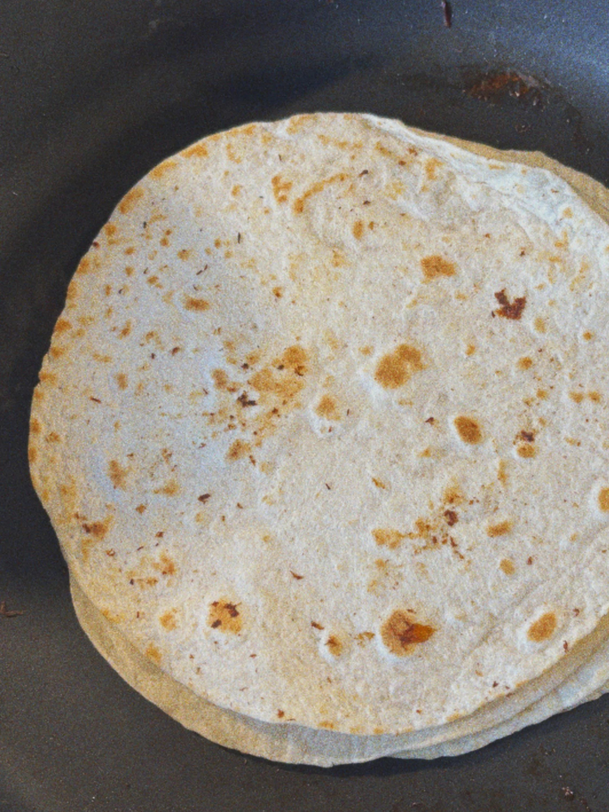To maximise flavour I used the residual fat and fond on the bacon pan to lightly fry the tortillas, I think it makes them look more appetising with homemade burnishing marks, it also means that flavour isn’t wasted from the bacon.