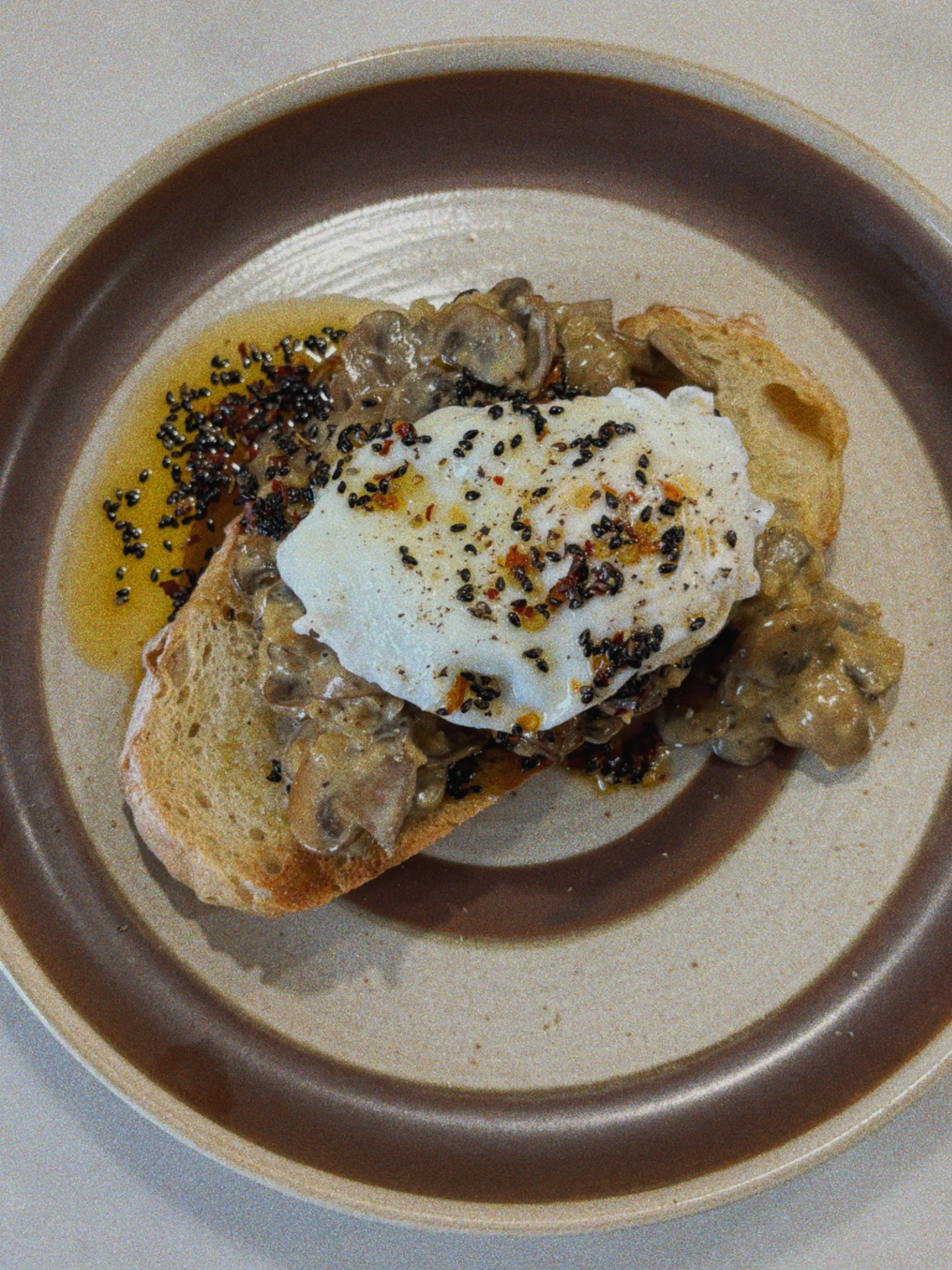 Drizzle the leftover oil on each toasted piece of bread, top each slice with half of the creamy mushrooms and a poached egg